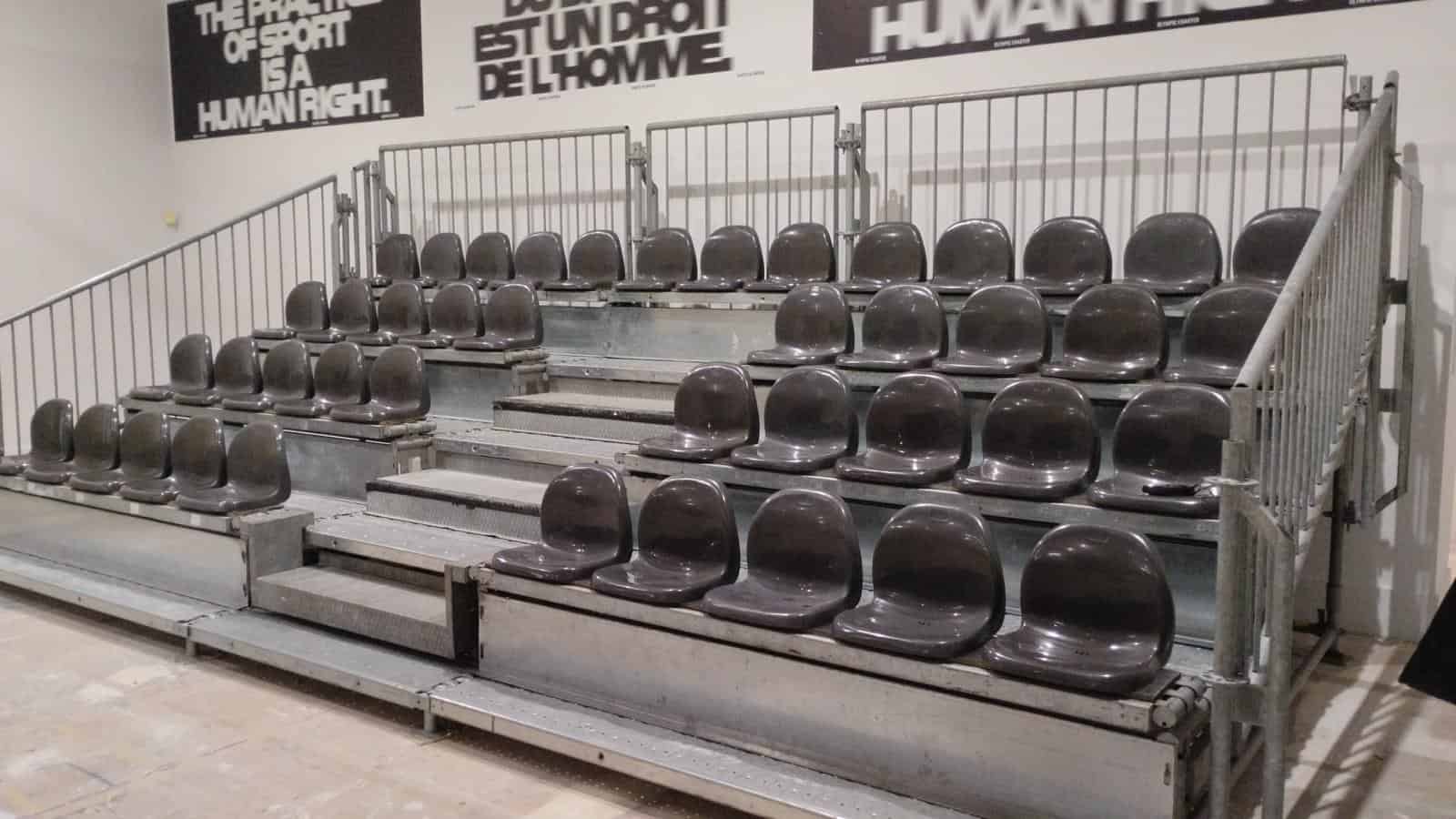 Tribuna modello base, seduta su panca. Piena modularità nella lunghezza.