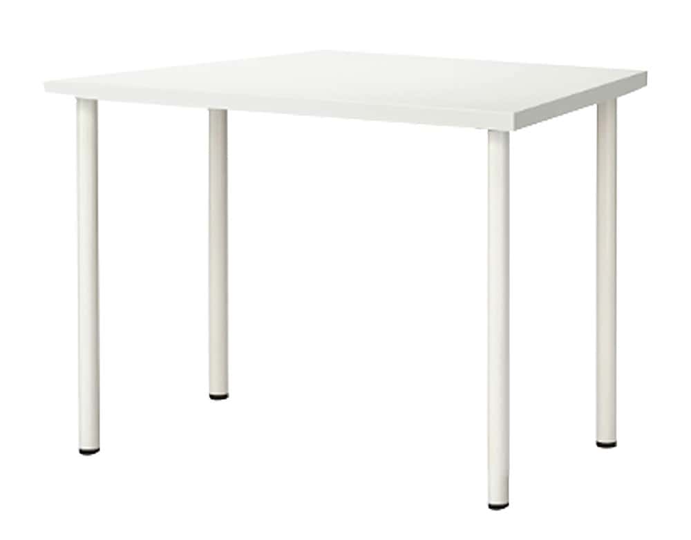Tavolo bianco con piano in legno e gambe in acciaio con rivestimento epossidico, piedini regolabili per montaggio anche su superfici irregolari. Leggero e facile da montare.